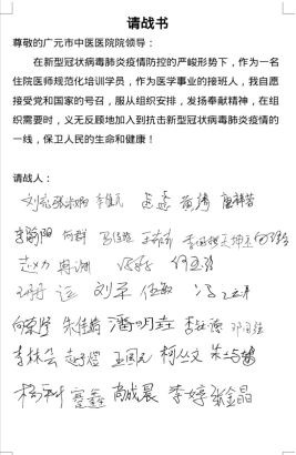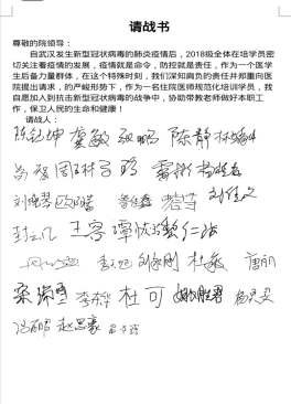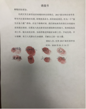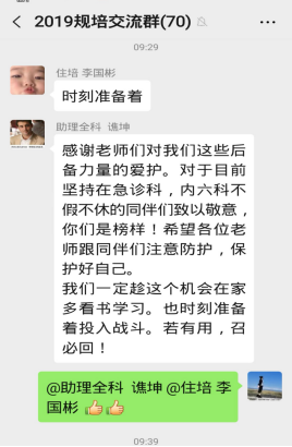 当我们的规培学员,得知我们的管理者和资深带教老师都早已战斗在抗疫一线后,纷纷主动请战,要求加入到抗击新型冠状病毒感染肺炎的战斗中,协助老师完成好各项工作,不计报酬,不论生死……