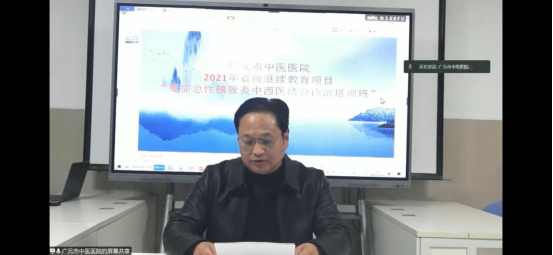 近日,广元市中医医院成功举办了省级中医药继续教育项目--重症急性胰腺炎中西医结合诊疗培训班。因新冠肺炎疫情影响,本次会议采取线上方式举行,来自省内外300余名医务人员通过网络直播的方式参加了培训。培训班开班仪式由党委委员、副院长陈兵主持,党委委员、副院长岳良明致辞。