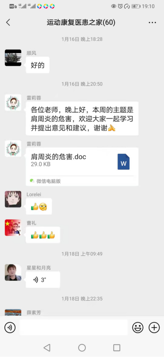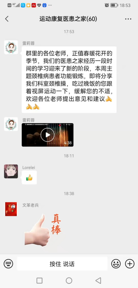 除了日常的健康宣教,运动康复科还建立了医患沟通群,每周一个主题为患者分享养身健康知识和锻炼视屏,深受患者们的好评。