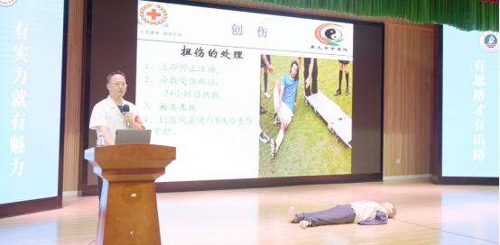 培训现场,副主任医师、急救专家夏胜勇针对教师在日常工作、生活中可能遇到的心肺复苏、溺水、烧伤、运动损伤、中暑等情况的急救进行了通俗易懂地讲解。