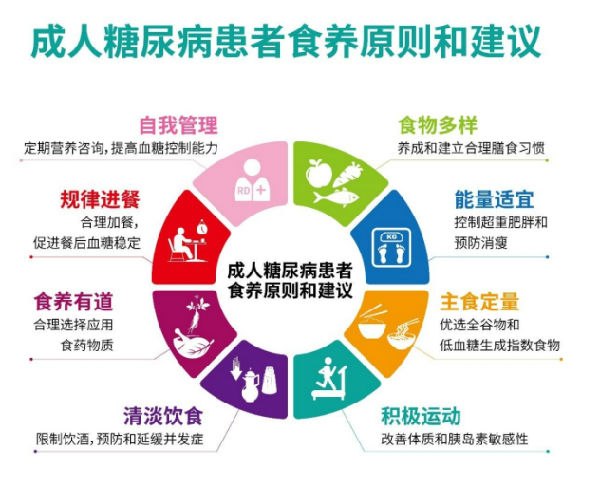 膳食管理和治疗是糖尿病患者血糖控制的核心,应遵循平衡膳食的原则,做到食物多样、主食定量、蔬果奶豆丰富、少油、少盐、少糖,在控制血糖的同时,保证每日能量适宜和营养素摄入充足。