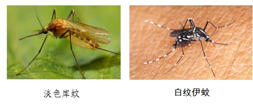 我们对比一下其他两种主要蚊虫的照片,形态特征差别还是非常明显的。淡色库蚊停落时尾部不会高高翘起,翅膀上也没有白斑。白纹伊蚊身体表面呈黑白相间的条纹,也就是我们俗称的“花蚊子”。