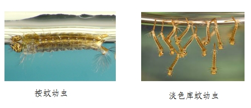 按蚊的幼虫多孳生于稻田、湖泊、池塘、溪流等水质较清、水生植物丰富的水体中,主要见于农村地区,喜欢叮咬牲畜和人。按蚊的幼虫也比较特殊,一般平“躺”在水面上,而淡色库蚊的幼虫一般悬吊在水面以下。