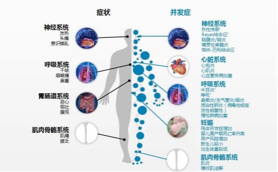 流感感染主要以发热、头痛、肌痛和全身不适起病,体温可达 39 ~ 40℃,可有畏寒、寒战,多伴全身肌肉关节酸痛、乏力、食欲减退等全身症状,常有咽喉痛、干咳,可有鼻塞、流涕、胸骨后不适,颜面潮红,眼结膜充血等。部分患者症状轻微或无症状。
