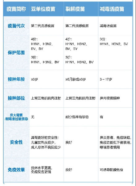 流感疫苗有灭活疫苗及减毒活疫苗。无特殊禁忌症的人群,可自愿接种任何种类,任何厂家的流感疫苗。流感疫苗的规格、适用人群等详见下图: