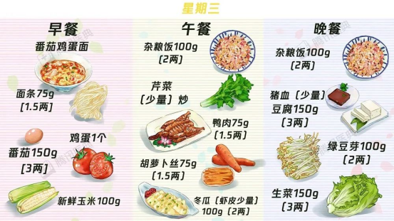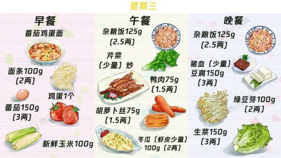 1.中晚餐的主食:建议用低升糖指数(GI)的食材,比如紫米、山药、红薯、荞麦等,也可做成杂粮饭。主食GI怎么看?