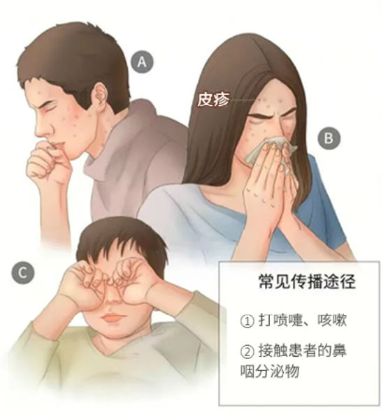麻疹患者是唯一的传染源,近距离接触患者,感染率达90%以上。主要通过飞沫传播(患者打喷嚏、咳嗽等)和直接接触传播(如患者的鼻咽分泌物)。