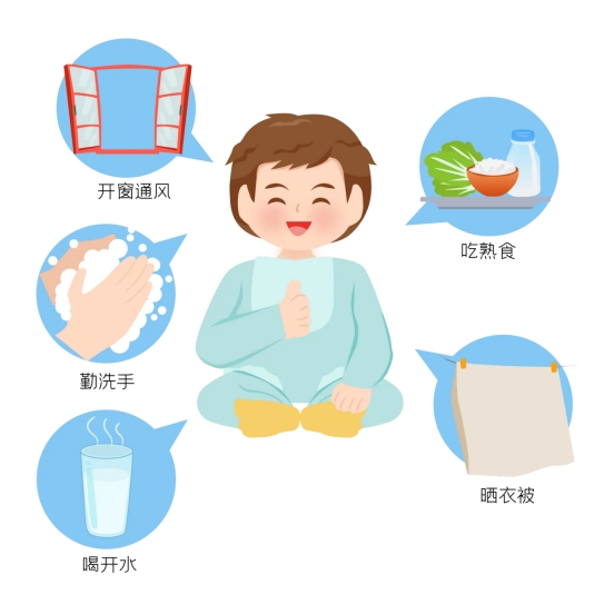 2.保持手卫生。避免用手触摸口、鼻、眼等易感染部位;咳嗽、打喷嚏时用纸巾遮住口鼻,在触摸公共物品后、外出游玩回家后、进食前、如厕后,以及家长在回家后、加工食品前、更换尿布或处理被粪便污染的物品后,用肥皂水或洗手液洗手。