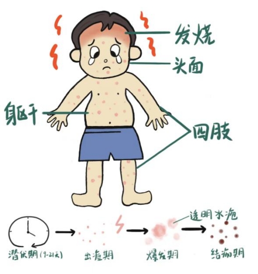 水痘是由水痘-带状疱疹病毒引起的急性呼吸道传染病,主要经呼吸道飞沫或直接接触传播,也可通过被污染的用具传播。人群对水痘普遍易感。潜伏期一般为10~21天,平均为14天,以皮肤、粘膜上分批出现的斑疹、丘疹、疱疹和结痂并伴有较轻的全身症状为特征。