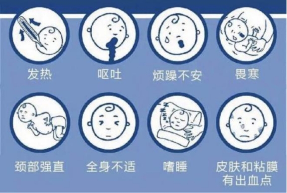 流行性脑脊髓膜炎,简称流脑,是由脑膜炎双球菌引起的急性呼吸道传染病。人群普遍易感,儿童发病率高。大多是通过呼吸道飞沫传播而感染。最初表现为上呼吸道感染,多数病人无明显症状,随后病人突然寒战,高热体温可达40℃,头痛、呕吐反复发作,早期皮肤上可见出血点或瘀斑,1~2日内发展为脑膜炎,高热持续不退,头痛剧烈,频繁呕吐,伴有惊厥,甚至出现昏迷。