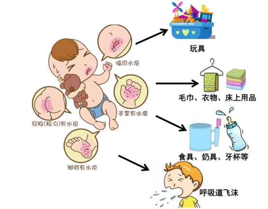 由肠道病毒(柯萨奇病毒、EV-A71等)引起,典型症状为发热和手、足、臀部等部位出现皮疹。5岁以下儿童高发,主要通过飞沫或接触患者分泌物及其污染物品传播。