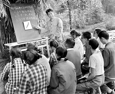 四川医学院钩端螺旋体病防治研究室的教师和医务人员,长期坚持钩体病防治研究工作,取得显著成效。这是1977年10月,从事钩体病研究20多年的该室主任戴保民,在给峨眉县胜利公社胜利大队的赤脚医生讲解钩体病的防治。