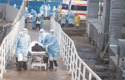 1月23日下达建设任务,2月2日完成交付。总建筑面积3.39万平方米,可容纳1000张床位的武汉火神山医院从方案设计到建成交付仅用10天时间。这是2月4日,医护人员将患者转运至武汉火神山医院病房。新华社记者 肖艺九 摄