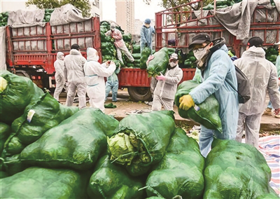 2月6日,武汉市民周良栋从外地收购的100吨新鲜蔬菜,经过40多个小时运输成功到达武汉。这些新鲜蔬菜捐赠给了当地街道、医院、部队以及养老院等单位。图为当地热心人士得知需要转运蔬菜的信息后,主动参加卸菜。李辉 摄