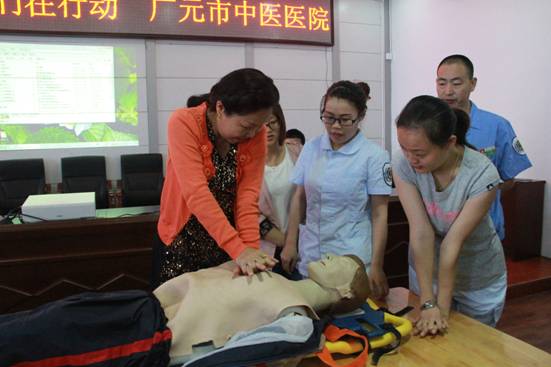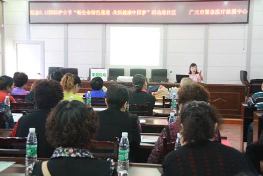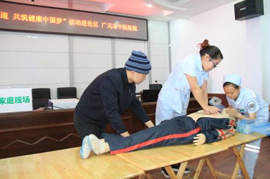 当天上午,广元老城政府街居委会4楼会议室座无虚席,来自社区干部和群众近100人现场接受一场别开生面的急救知识和急救能力教育。一是听取了我院急诊科王秀蓉主任就家庭常见突发病,例如脑出血、心脏病、一氧化碳中毒等突发病如何应急处理作了详细的讲解;二是设置了情景现场,现场模拟一女性突发冠心病,向大家展示了家属如何正确拨打120急救电话,120指挥中心如何处警,医院如何接警出诊,医护人员现场如何心肺复苏等整个救援过程;三是由我院老年科刘震主治医师为居民作了慢性阻塞性肺疾病家庭讲座;四是医护人员对社区居民进行心肺复苏现场培训和指导。让社区居民掌握了基本的医疗急救知识,进一步提高了自救能力。