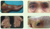 麻风病的临床表现多种多样,早期主要是皮肤上出现不痛不痒的浅色或红色斑片,如不能早期发现和治疗,病期长时皮肤多伴有感觉减退或丧失,病情逐渐发展后可以出现兔眼、歪嘴、爪形手、垂足、足底溃疡等畸残。