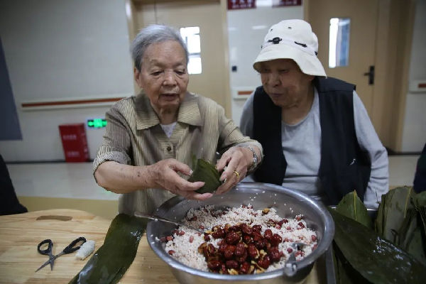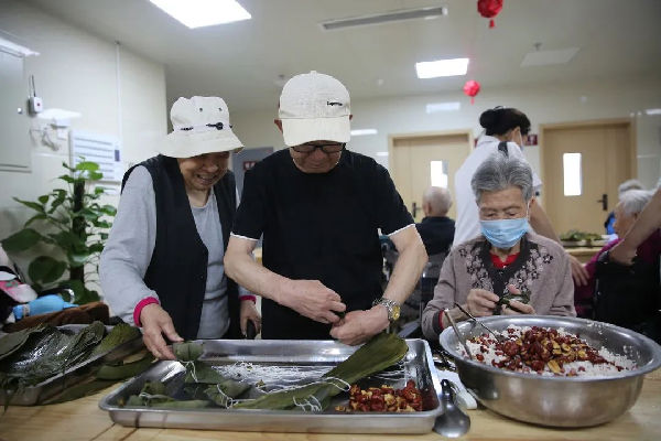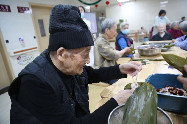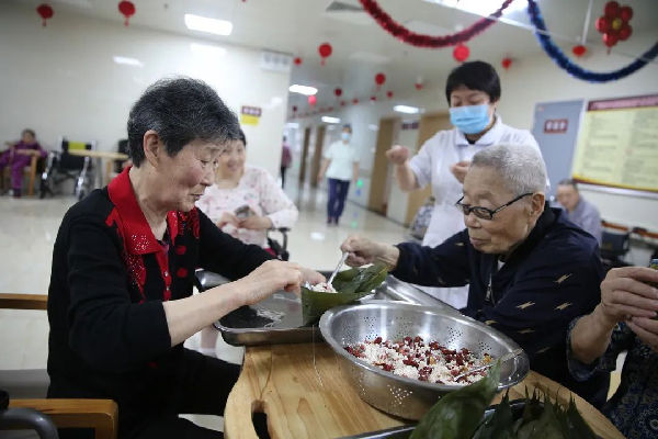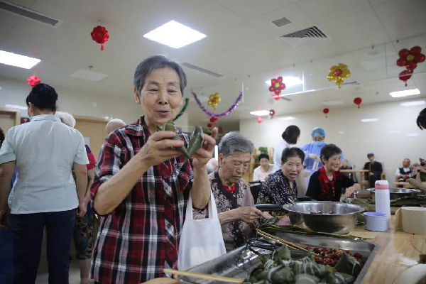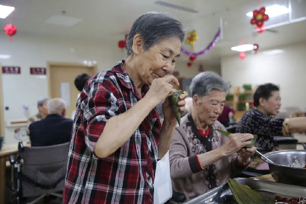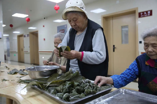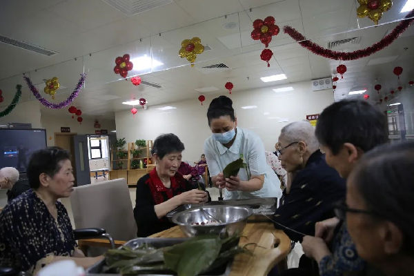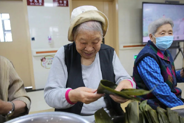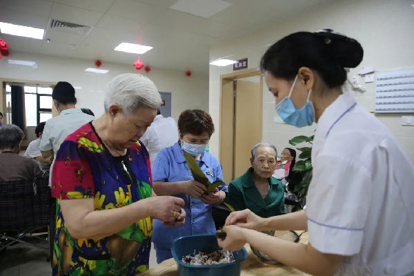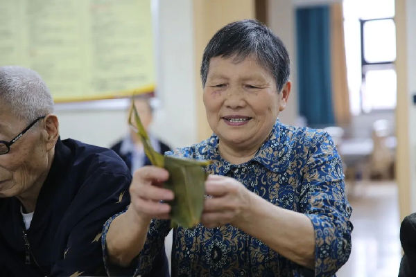 “粽子香,香厨房。艾叶香,香满堂...”。照护区提前准备好了糯米、大枣、小米等食材,医务人员与老人们一边包粽子一边亲切拉家常。雪白晶莹的糯米、红润的大枣、翠绿飘香的粽叶在经验丰富的老人们手中不一会儿就变成了一个个棱角分明的粽子,赢得了大家的赞叹。