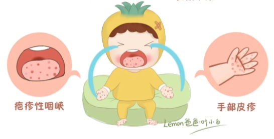 先出现发烧症状,手心、脚心出现斑丘疹和疱疹(疹子周围可发红),口腔粘膜出现疱疹或溃疡,疼痛明显。部分患者可伴有咳嗽、流涕、食欲不振、恶心、呕吐和头疼等症状。