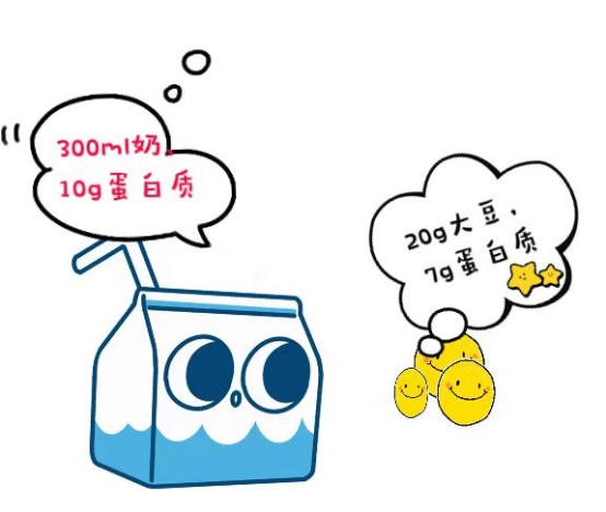 √300ml的牛奶(提供约10g蛋白质),20g大豆(相当于北豆腐60g、南豆腐110g、豆干45g、豆浆300ml,提供约7g蛋白质)