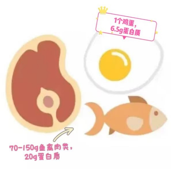 √每天1个鸡蛋(提供约6.5g蛋白质),70-150g鱼禽肉类食物(提供约20g蛋白质)