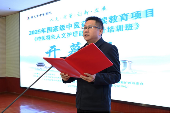 侯昌华代表市卫健委和市中医药管理局讲话。他指出,此次双向联动培训是广元市中医药继续教育工作的重要里程碑。他高度评价了市中医医院护理团队的工作,并对全体学员、市中医院及全市护理队伍分别提出殷切希望:学员要潜心研学、学以致用;市中医院要扛牢责任、树立标杆;全市护理队伍要加强协作、共建共享,不断提升人民群众的健康获得感。